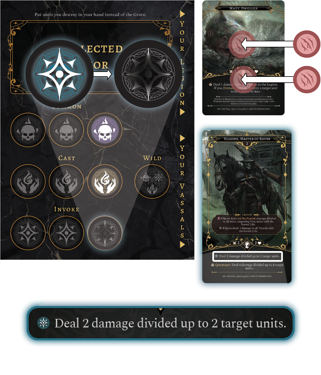 Damage can be dealt through Combat, Spells and Invocations. When a Unit is dealt damage, a Damage Counter is added on it. When the Damage Counter exceeds the amount of Life that Unit has, it will be destroyed. In Legions of Kadmon, when a Player destroys a Unit, it does not go into the Graveyard. That Player instead put those Units in their hand.