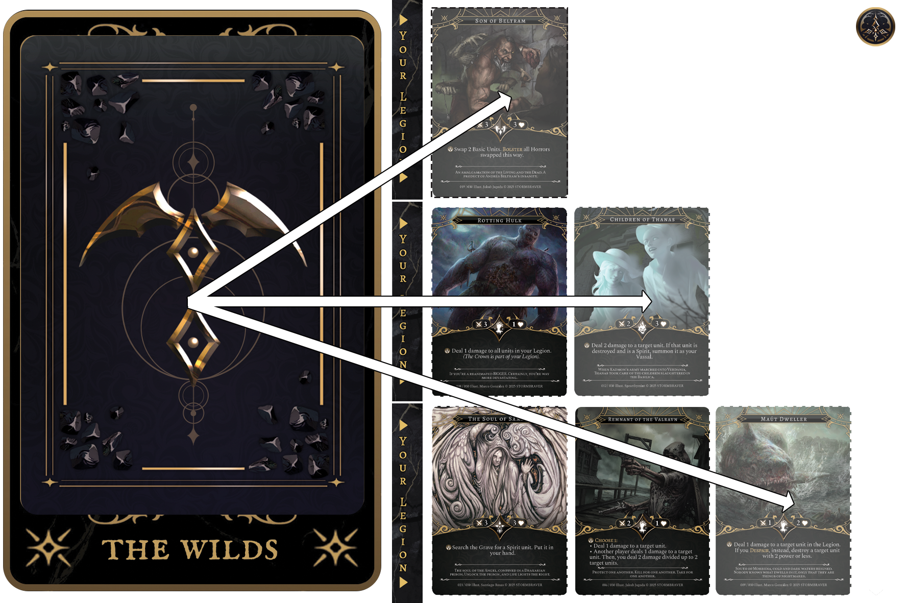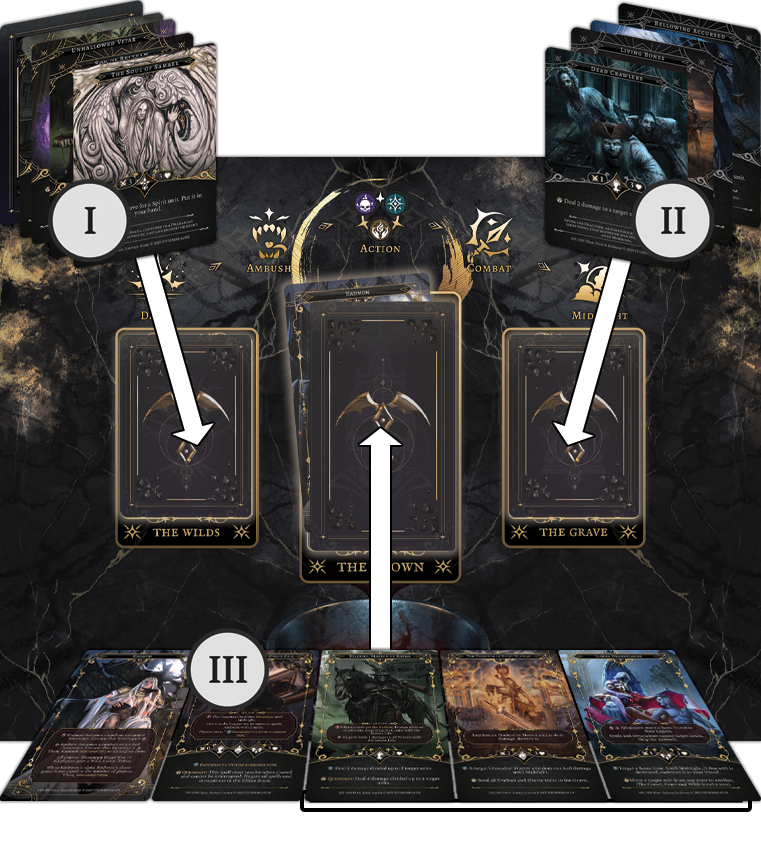The Ambush Phase is the spawning of threats to each Player’s Zones. Starting from player with Kadmon’s Sigil, a Normal Unit will be revealed from the top of the Wilds and Summoned into a Player’s Legion. A player must defeat these units in order to deal damage to the Ruling Sovereign and obtain Ichor (Victory Points). There are many way a Player can achieve this, and all of them are done through the Action Phase.