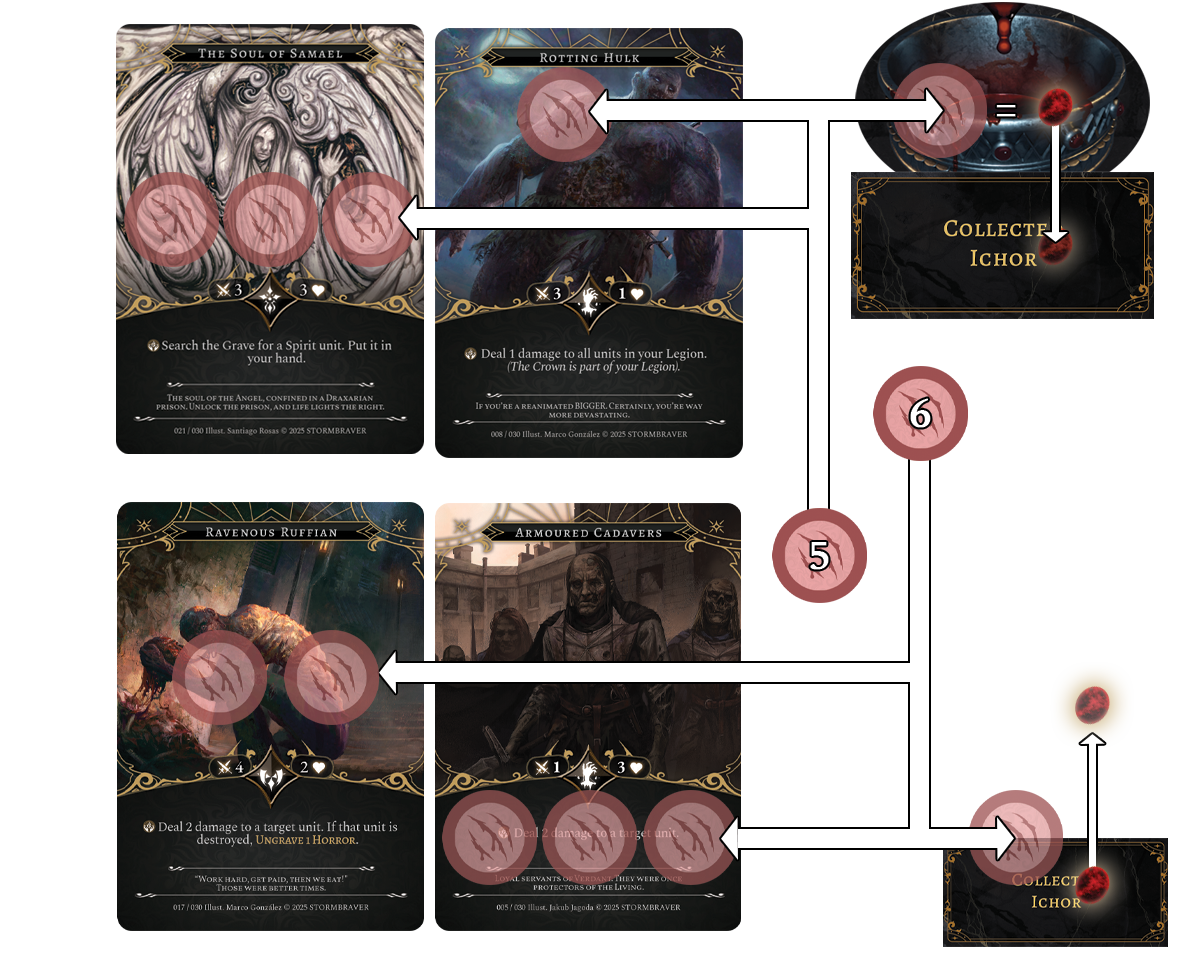 During the Player’s Death. That Player loses 1 Ichor, Ungrave (Draw from the Graveyard) to Maximum Hand and units in that Player’s Legion escapes back into the Wilds.